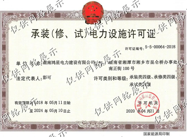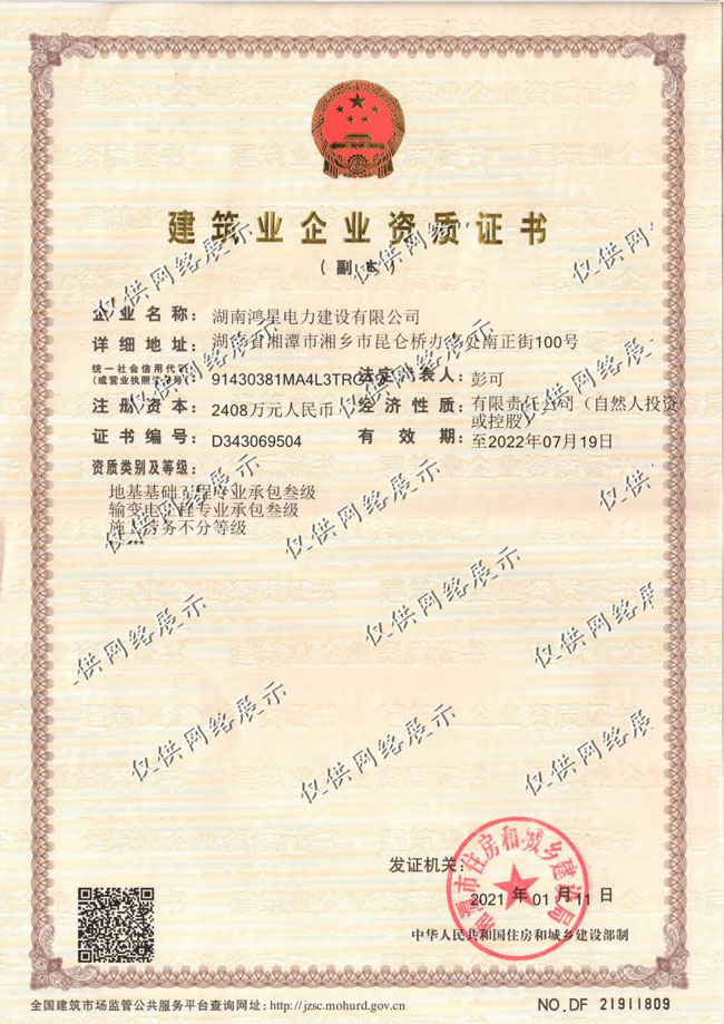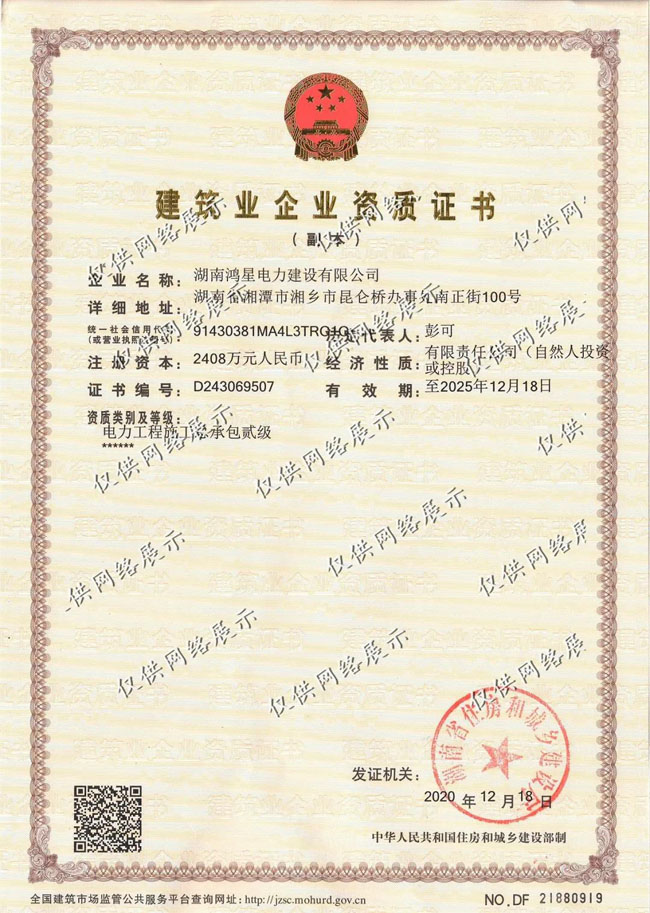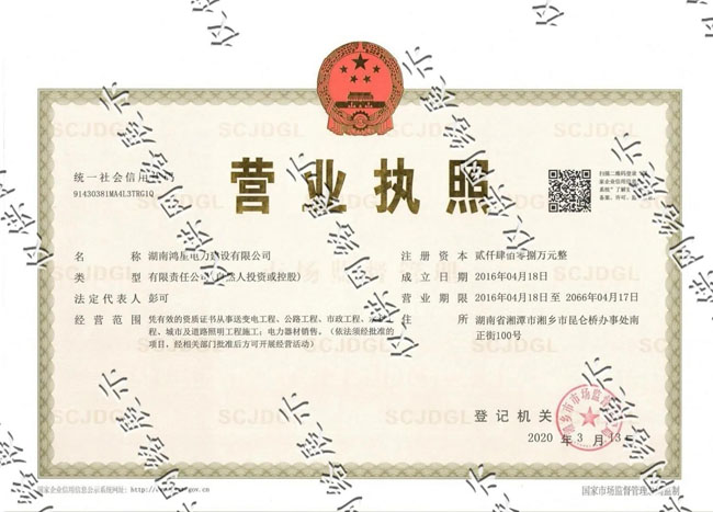 湖南鴻星電力建設(shè)有限公司(簡稱"鴻星電建")于2016年04月18日成立。公司擁有良好的經(jīng)濟基礎(chǔ)條件,注冊資本為2408萬元。公司經(jīng)營范圍包括:憑有效的資質(zhì)證書從事送變電工程、公路工程、市政工程、水利工程、城市及道路照明工程施工;電力器材銷售等。